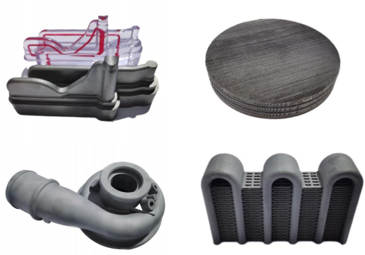 此类型零部件传统是使用铸造的方法制造的,难点在于内部孔洞无法做到复杂结构,从而造成散热效率不足,加工周期长。改用3D打印后,散热效率大大提升,研发验证周期大大降低。