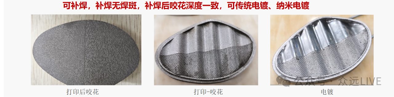 工艺适配性:支持补焊(补焊后咬花深度一致)、传统电镀及纳米电镀,解决3D打印鞋模后期花纹修改难题。