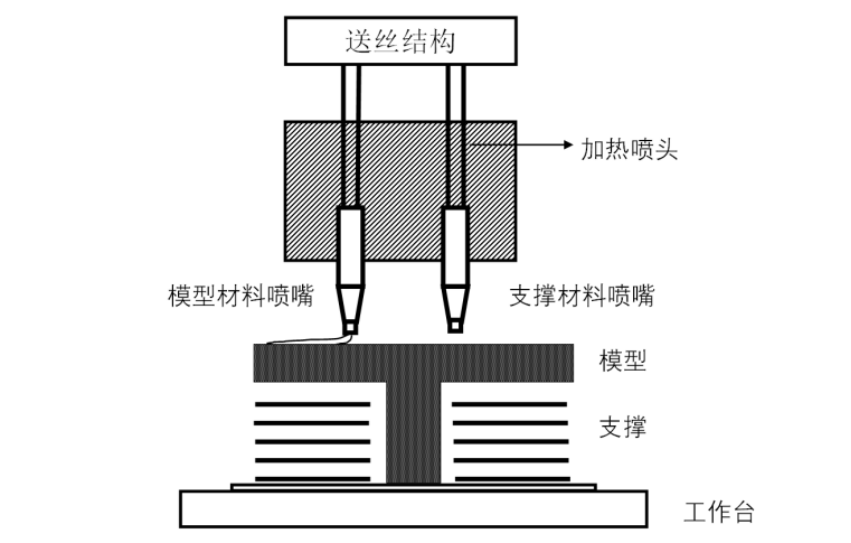丝状材料通过送丝结构送进喷头,在喷头内被加热熔化;喷头在计算机控制下沿零件层片轮廓和填充轨迹运动,同时将熔融的材料挤出,使其沉积在指定的位置后凝固成型,与周围已经成型的材料黏结,层层堆积成型后完成零件制造。
