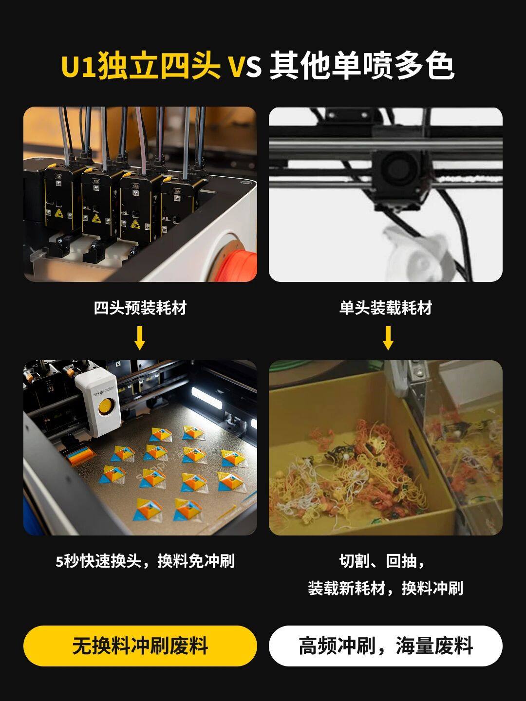 Snapmaker U1推出核心卖点SnapSwap™ 独立四头并联系统,支持4个独立打印头,5秒快速换头,多色多材料自由组合。